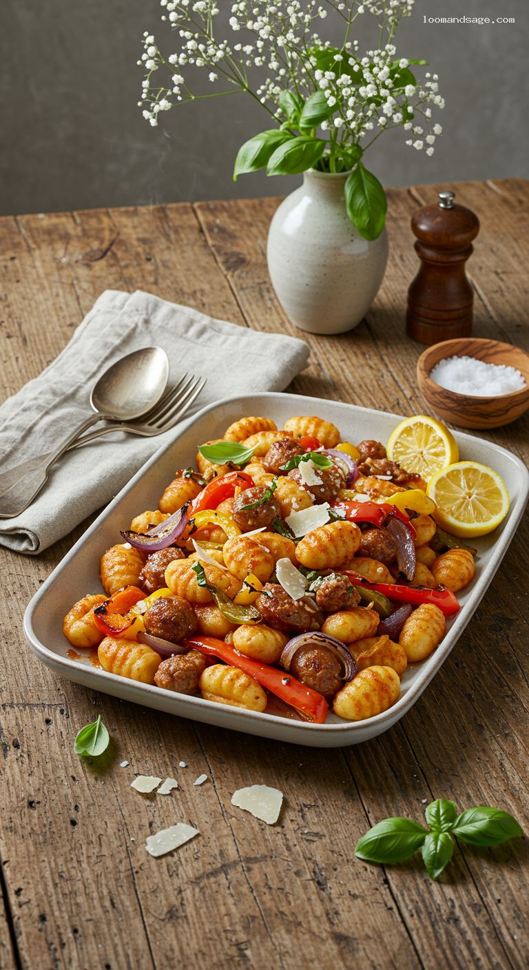 - 5. Roast 15 minutes; stir and flip gnocchi; roast 8–10 minutes more until gnocchi edges are crisp and sausage is browned.