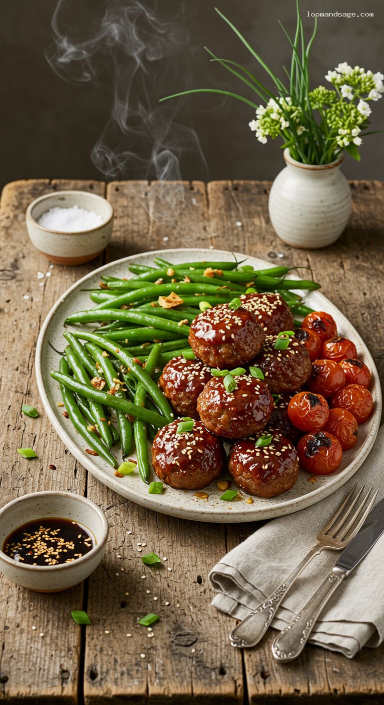 On the prepared sheet pan, toss green beans and cherry tomatoes with neutral oil, 1 tsp sesame oil, sliced garlic, half the sesame seeds, salt, and pepper. Spread in an even layer, leaving a clear space in the center where the meatloaves will go. Roast for 8 minutes to jump-start blistering and soften the beans.