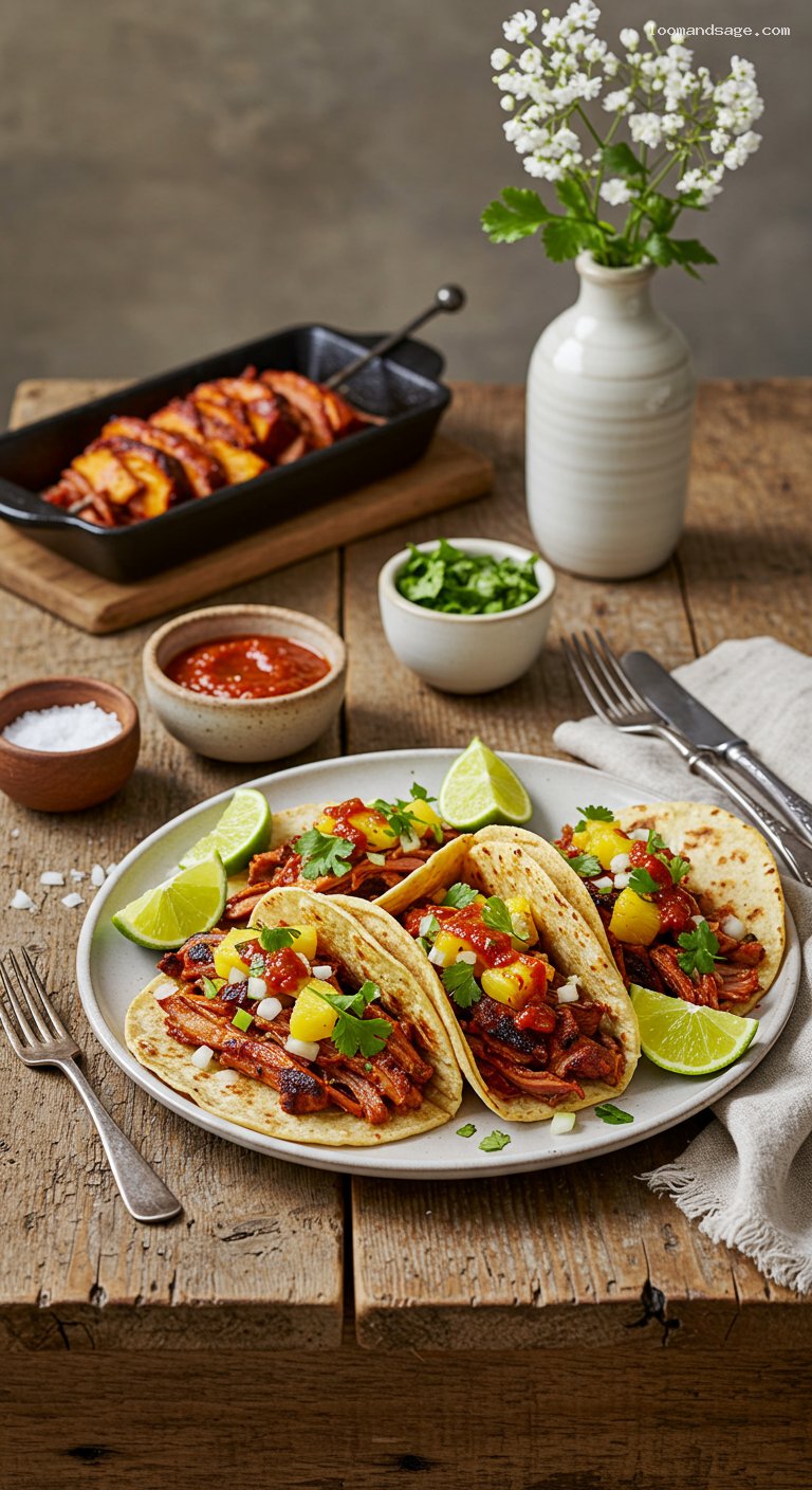 - Chicken al pastor: Swap pork for 2 lb boneless, skinless chicken thighs; marinate 4–12 hours, then roast at 425°F for 25–30 minutes or grill to 175°F in the thickest part.