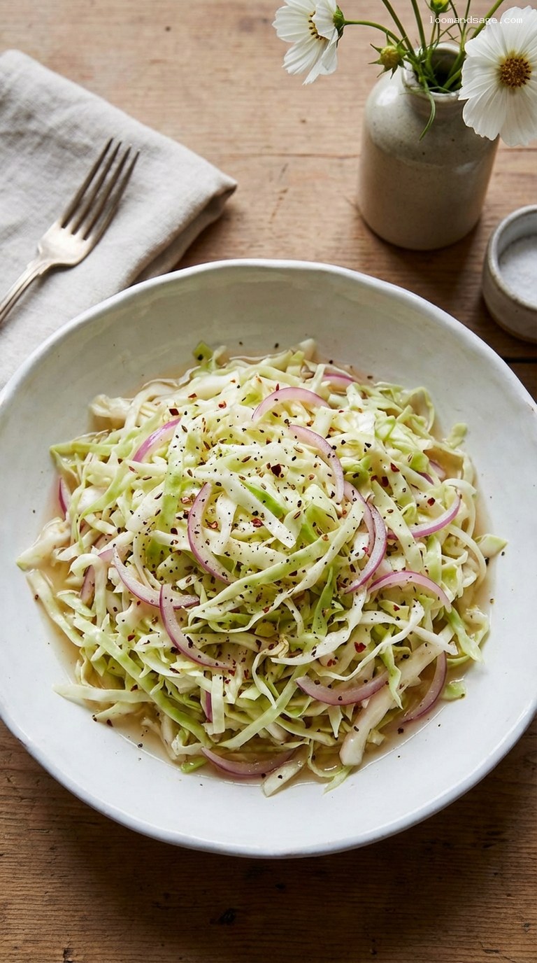 To serve as a simple tangy slaw, lift the cabbage out of the brine with tongs, letting the excess drip off. Pile onto plates, tuck into sandwiches or burgers, spoon over tacos, or serve alongside grilled meats or roasted vegetables. For a richer version, drizzle in 1–2 tablespoons of olive oil and toss just before serving. Fresh herbs and a squeeze of citrus are excellent last-minute brighteners.