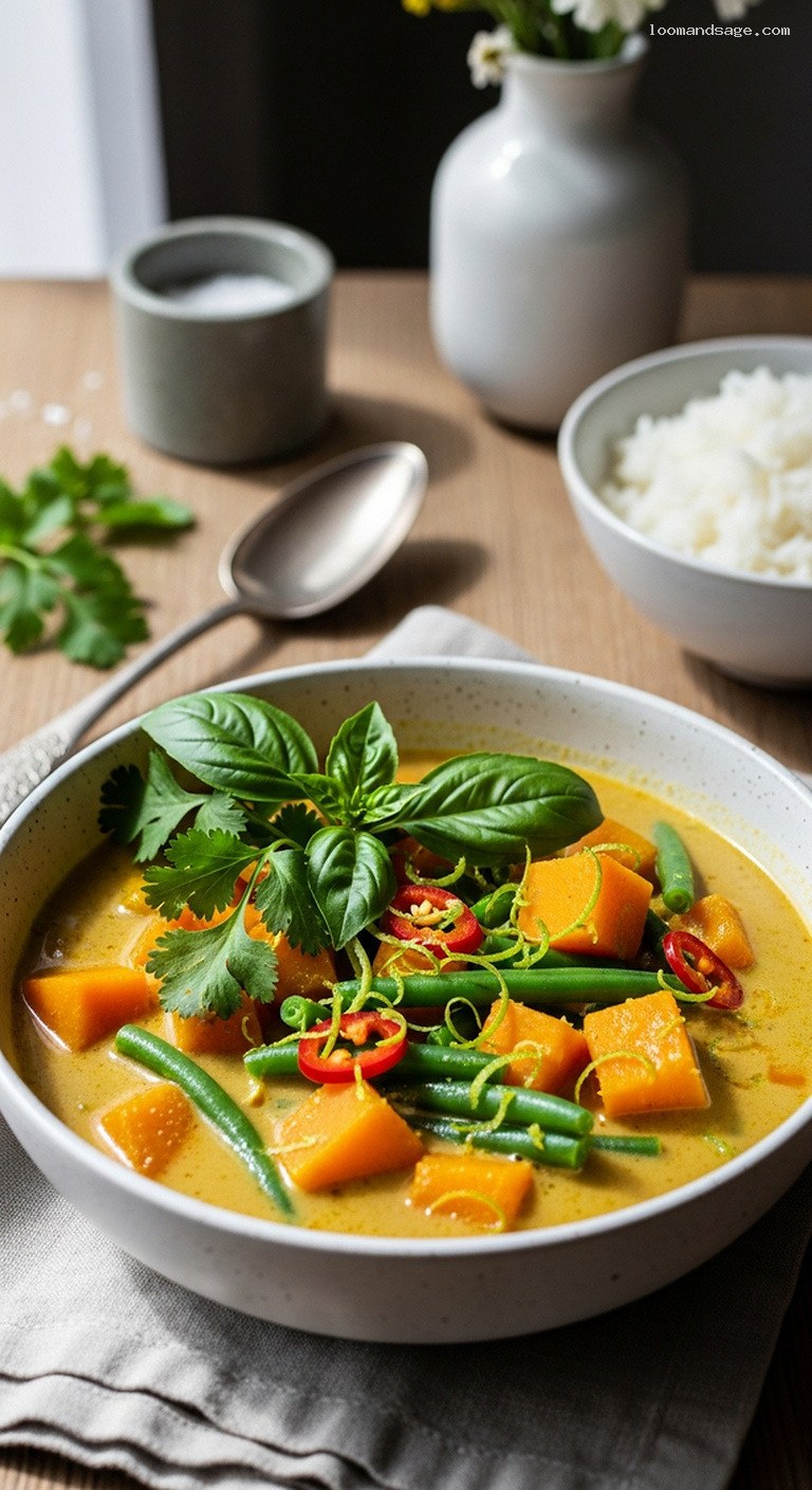 Spoon hot jasmine rice into bowls. Ladle the pumpkin coconut curry over or around the rice so you get a mix of pumpkin cubes, green beans, and plenty of broth in each serving. Garnish generously with chopped cilantro and Thai basil leaves, and sprinkle with sliced red chili for color and heat if you like. Offer lime wedges at the table so everyone can brighten their bowl to taste. Serve immediately while steaming hot, enjoying the contrast of creamy coconut, tender pumpkin, crunchy beans, and fragrant lemongrass-lime broth.